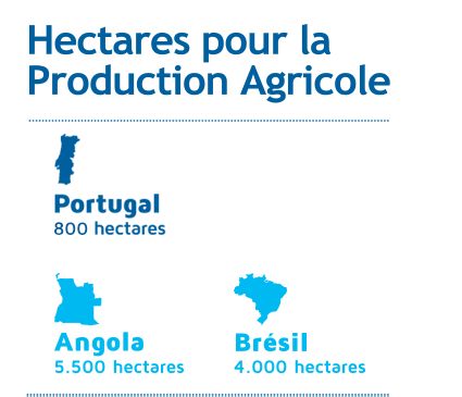L’agriculture intensive est réalisée par Euroeste, au Portugal, avec une exploitation de 800 hectares irrigués par des pivots d’irrigation, contrôlés à distance. En Angola, avec près de 5.500 hectares de la zone destinée à l’intervention agricole, la culture des céréales étant effectuée, annuellement, sur 4.000 hectares. Au Brésil, la production agricola ést réalisée sur 4.000 hectares.